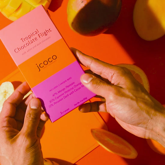 Experience three lush flavors of the Tropics in this chocolate flight that includes high percentage cacao milk, 72% dark, and a surprising white chocolate made with pure cocoa butter. A freshly sliced orange dusted with cayenne pepper is a full sensory experience and surprisingly refreshing. Mango and plantain chips with a little heat are balanced against a fruit forward dark milk chocolate. Finally, a pure, fine, rare, high aroma cacao with cracked nibs lets you taste notes of fresh cacao with a pleasing crunch. Together these three gourmet chocolate bars deliver a fruity, salty, and undeniably satisfying adventure that’s hot hot hot.